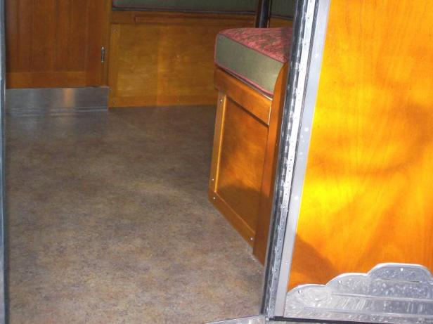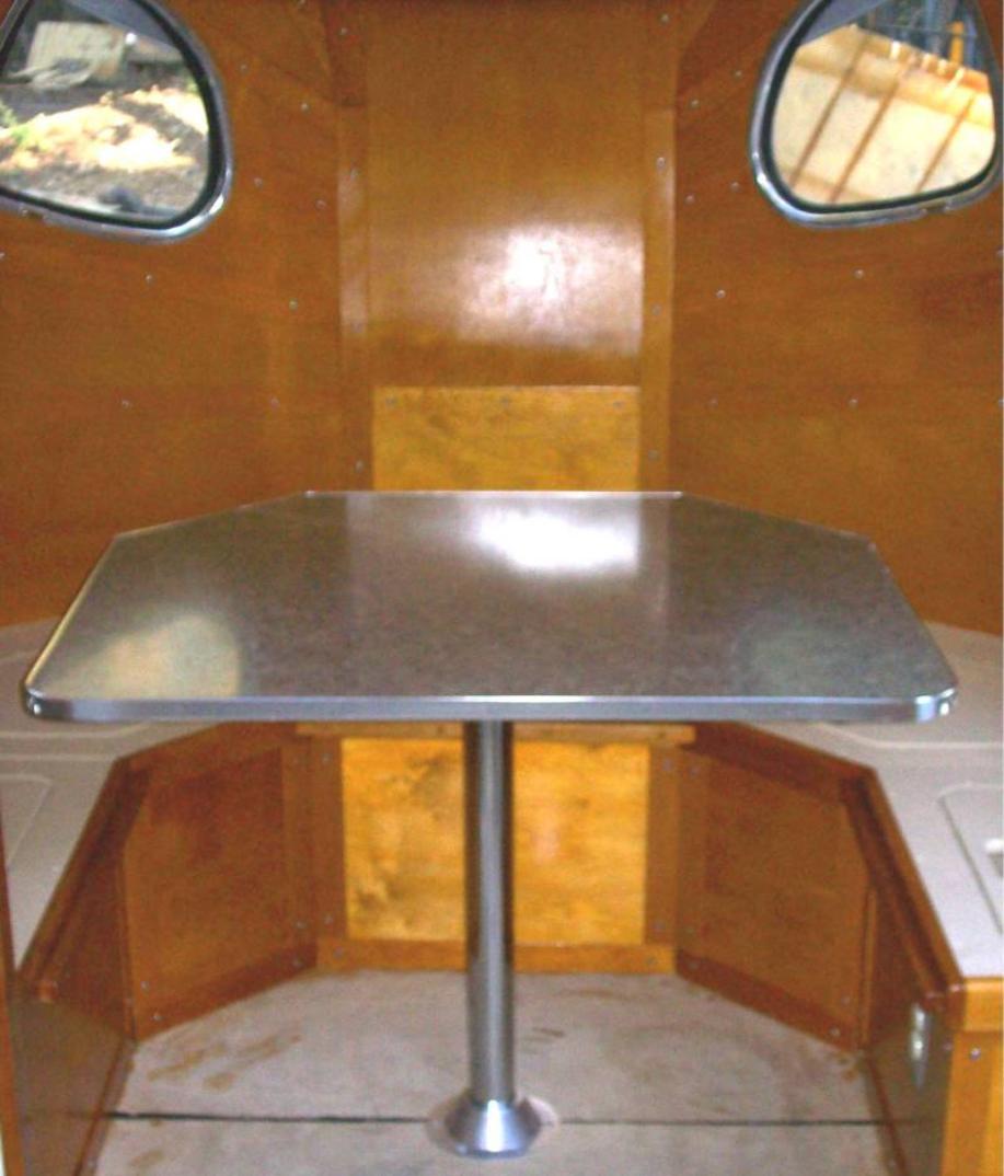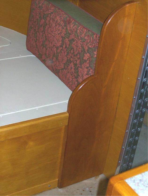 | Seating Area Trimmed Out & Table Built Notice Storage Access on Seating Bench