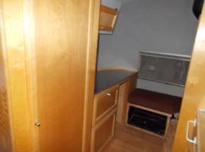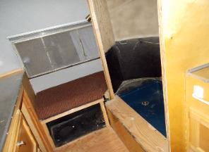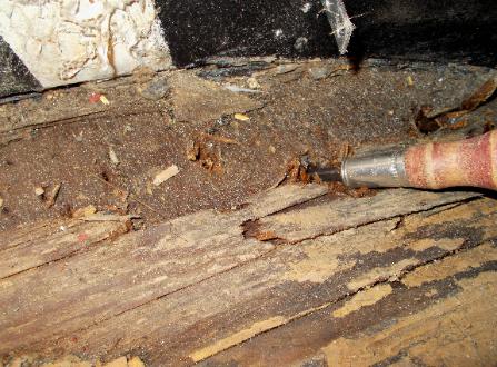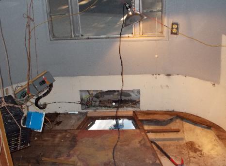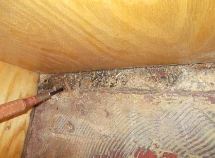 | Dining Area. Floor Out. Notice Knife in top left corner. That's Wood Rot. Everything you see in this picture will be removed to make necessary floor repairs & design changes. |